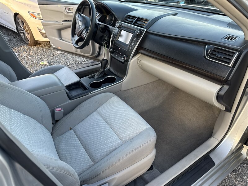 2016 Toyota Camry LE — Predawn Gray Mica exterior, Almond cloth interior. Powered by Toyota’s 2.5L inline-4 producing 178 hp and 170 lb-ft of torque, paired with a smooth 6-speed automatic transmission and front-wheel drive. This Camry has under 56,000 miles (averaging less than 6,000 miles per year), is in excellent overall condition, and has a clean CARFAX. Fuel economy is EPA-rated at approximately 25 MPG city and 35 MPG highway.